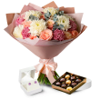 - Un bouquet de chrysanthèmes blancs, violets ou roses, de roses et d'eucalyptus ;